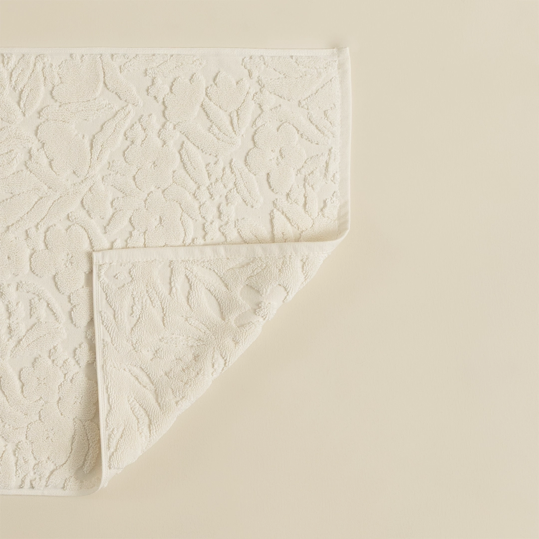 تجسد النقاء الفندقي للون الأوف وايت. التطريز المنسوج الجاكار يرفع من جودتها، بينما تمنحها أطراف الدانتيل شخصية فريدة.