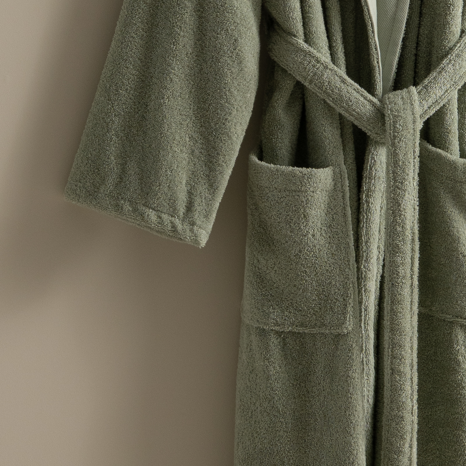 مصنوع من قطن 100% ناعم وعالي الامتصاص، بتصميم لف عملي مع حزام خصر وجيوب جانبية.