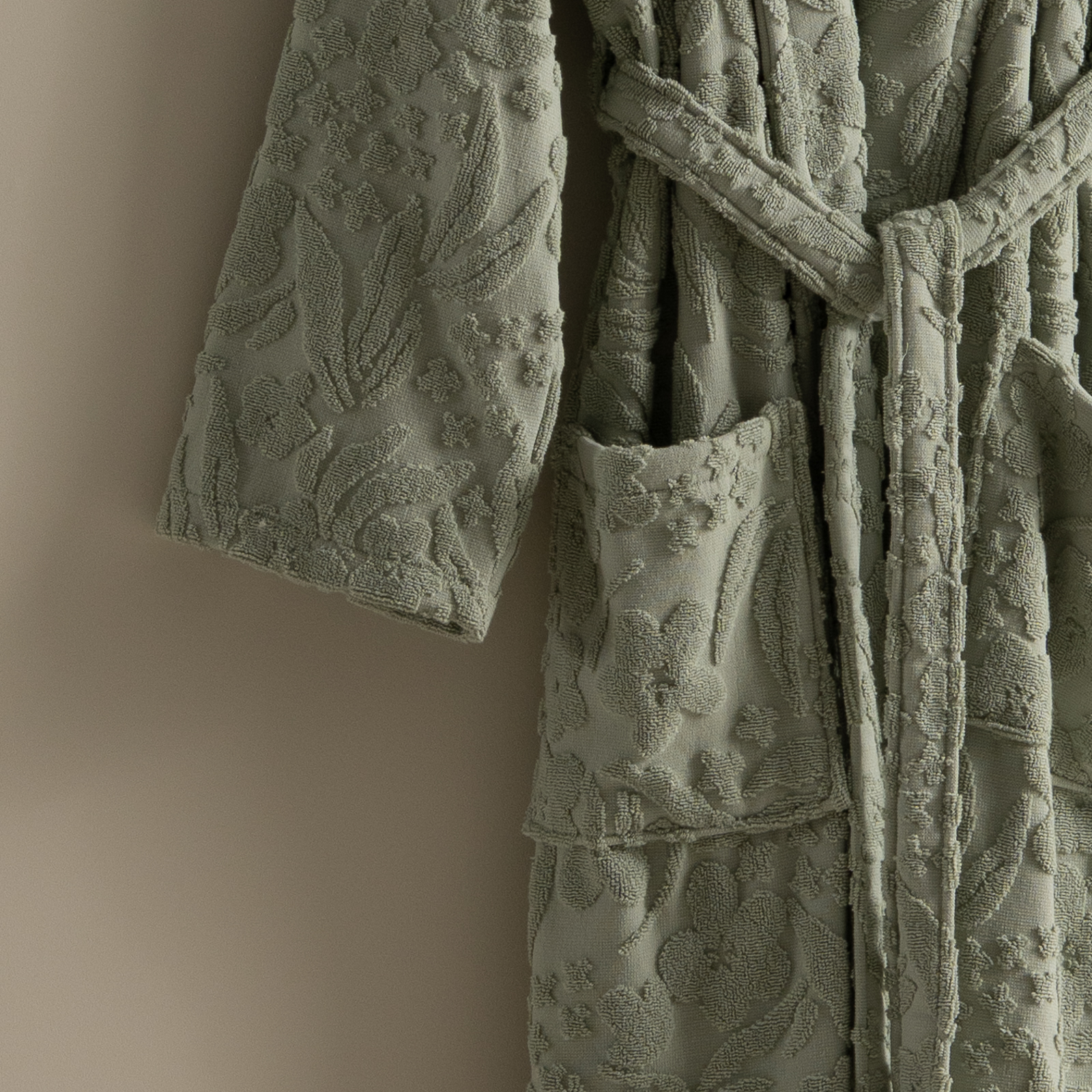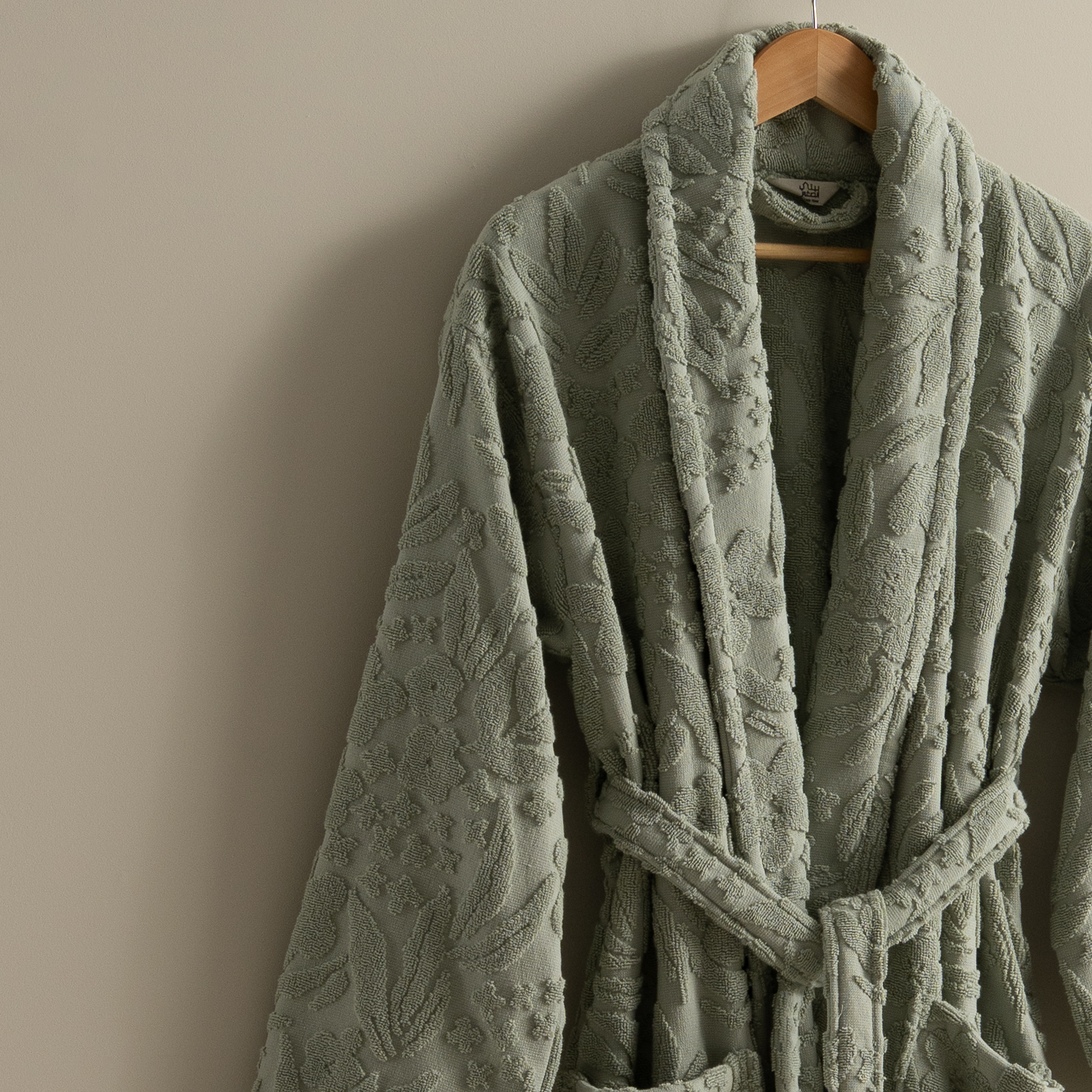 مصنوع من قطن 100% ناعم وعالي الامتصاص، بتصميم لف عملي مع حزام خصر وجيوب جانبية.