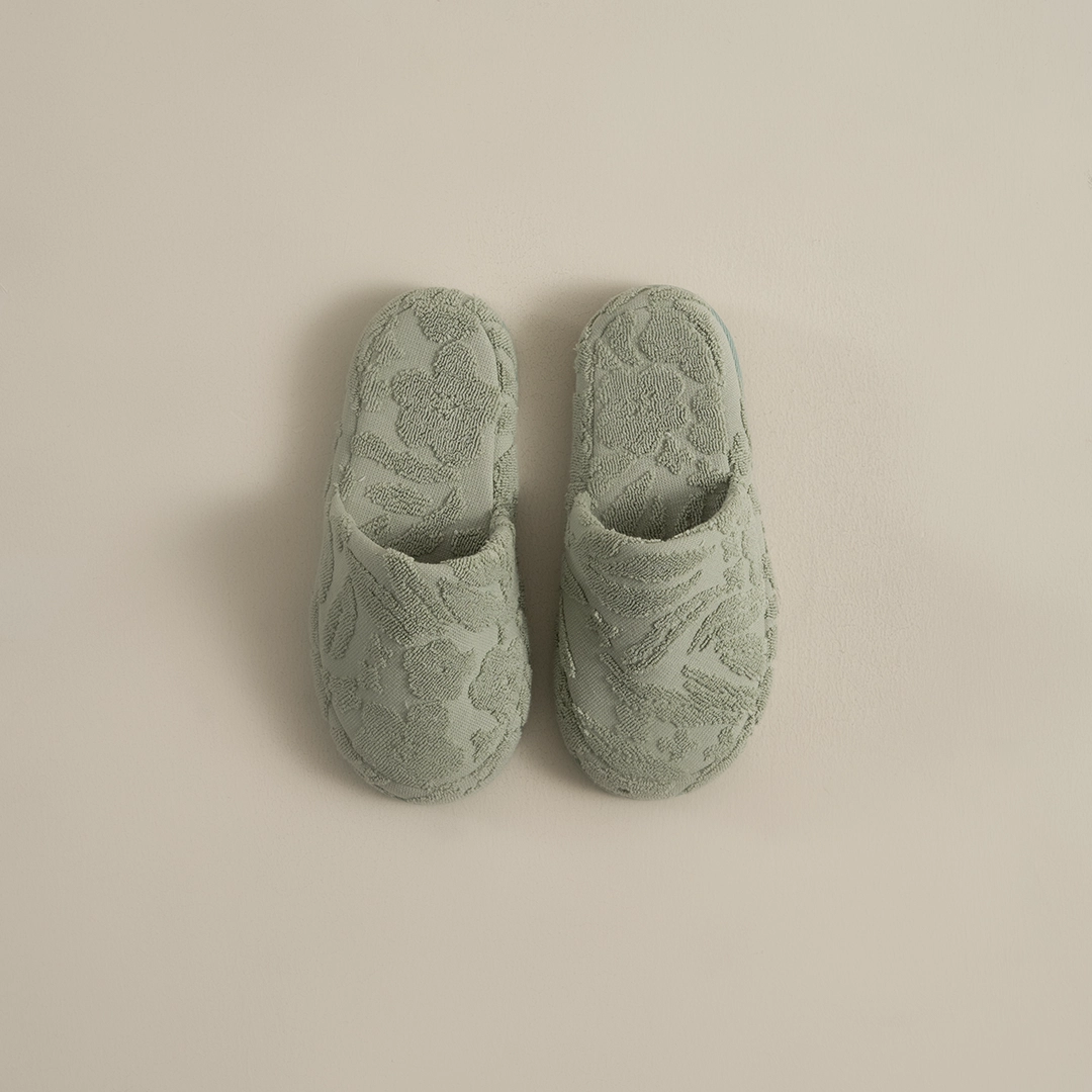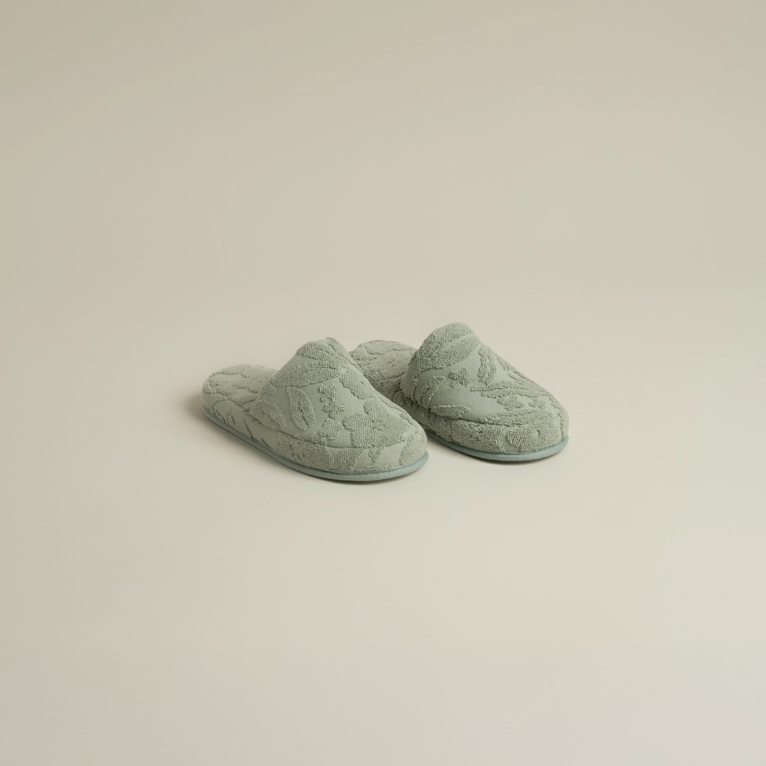 سليبر أخضر جاكار أنيق يكمّل إطلالة الحمام أو غرفة النوم، ويمزج بين الانسيابية والفخامة.