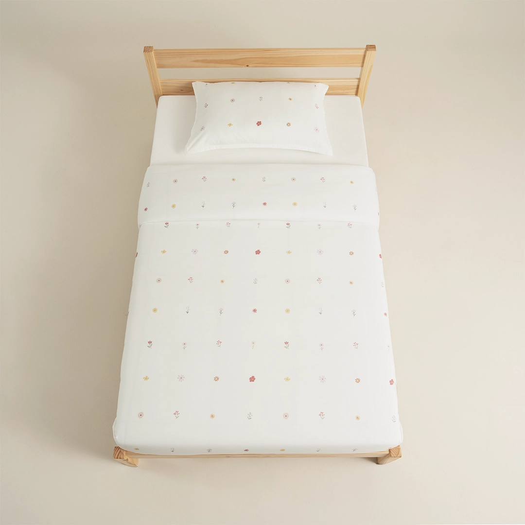 بيت لحاف برسومات زهور لطيفة يناسب غرف البنات، بدون حشوة فقط تلبيسة، يمكن حشوه بحشوة متوفرة لديك او شراء حشوة مناسبة لمقاسه من الحشوات المتوفرة لدينا والتي تثبت عليه بأربطة جانبية، بالإضافه انه قابل للغسيل حسب تعليمات الغسيل الموضحه بالأسفل، متوفر باللون الأوف وايت بمقاس مفرد مكون من قطعه واحده، من بيتي الصغير
